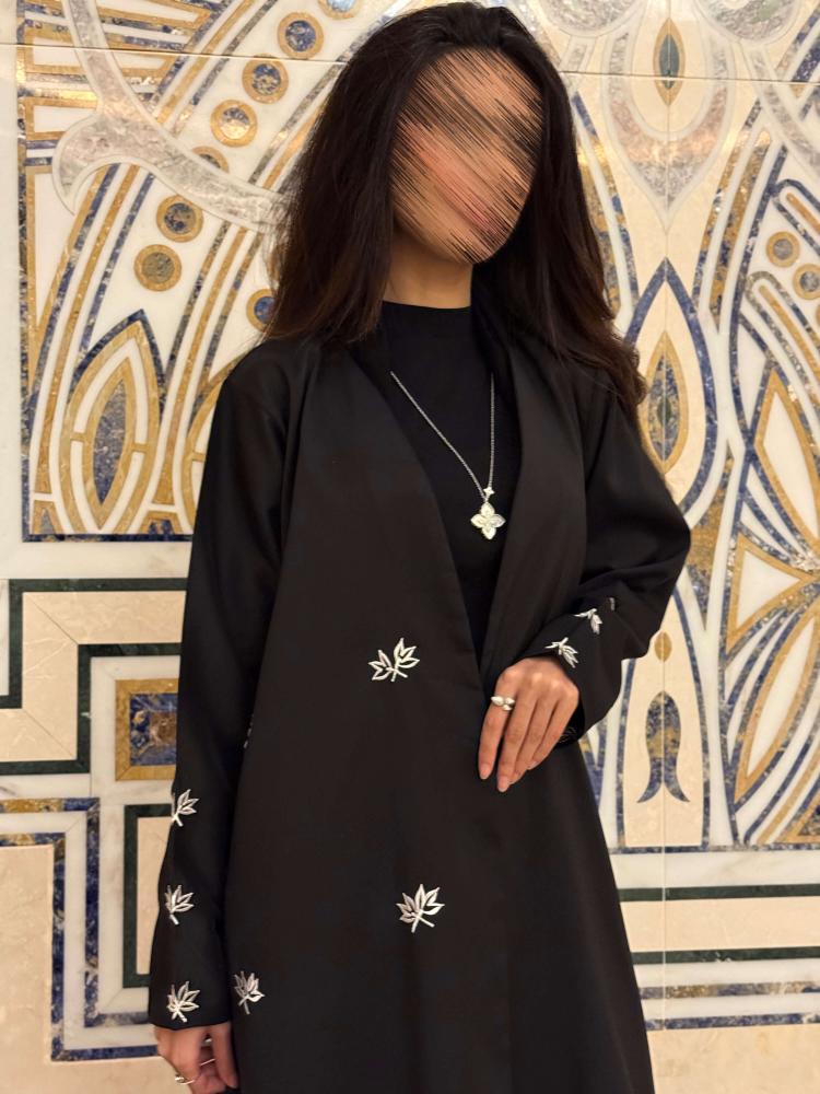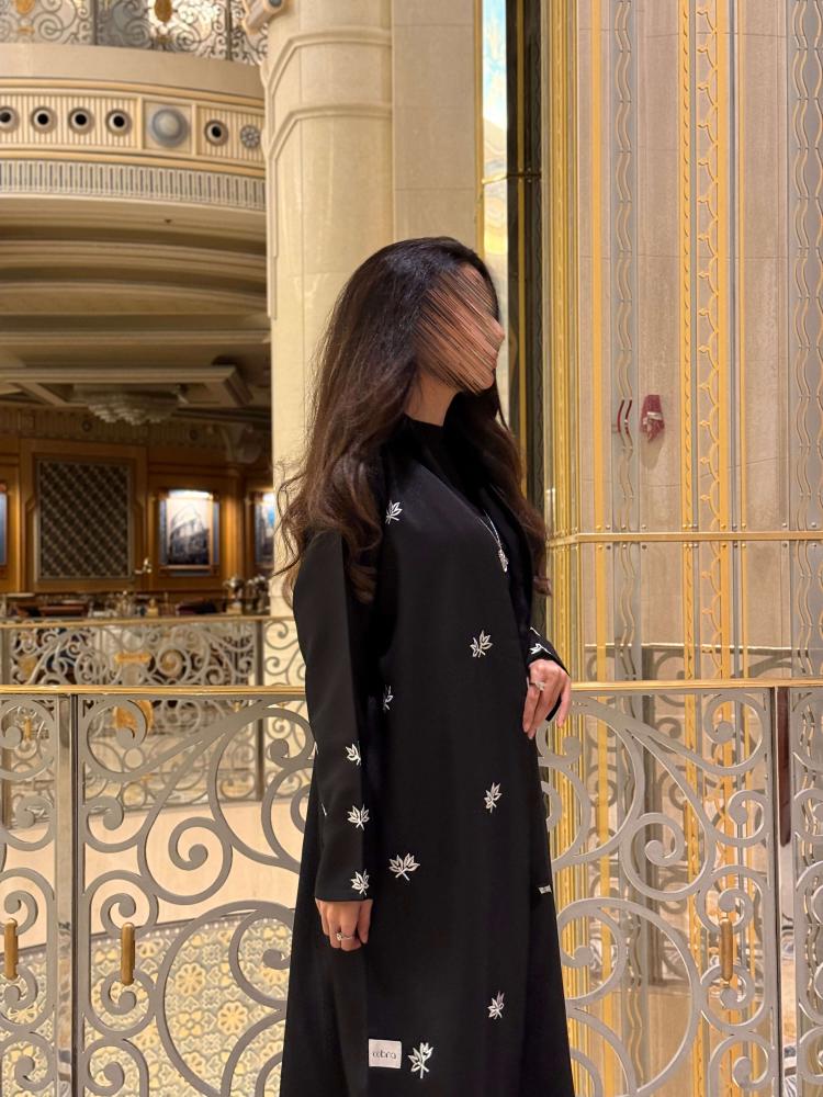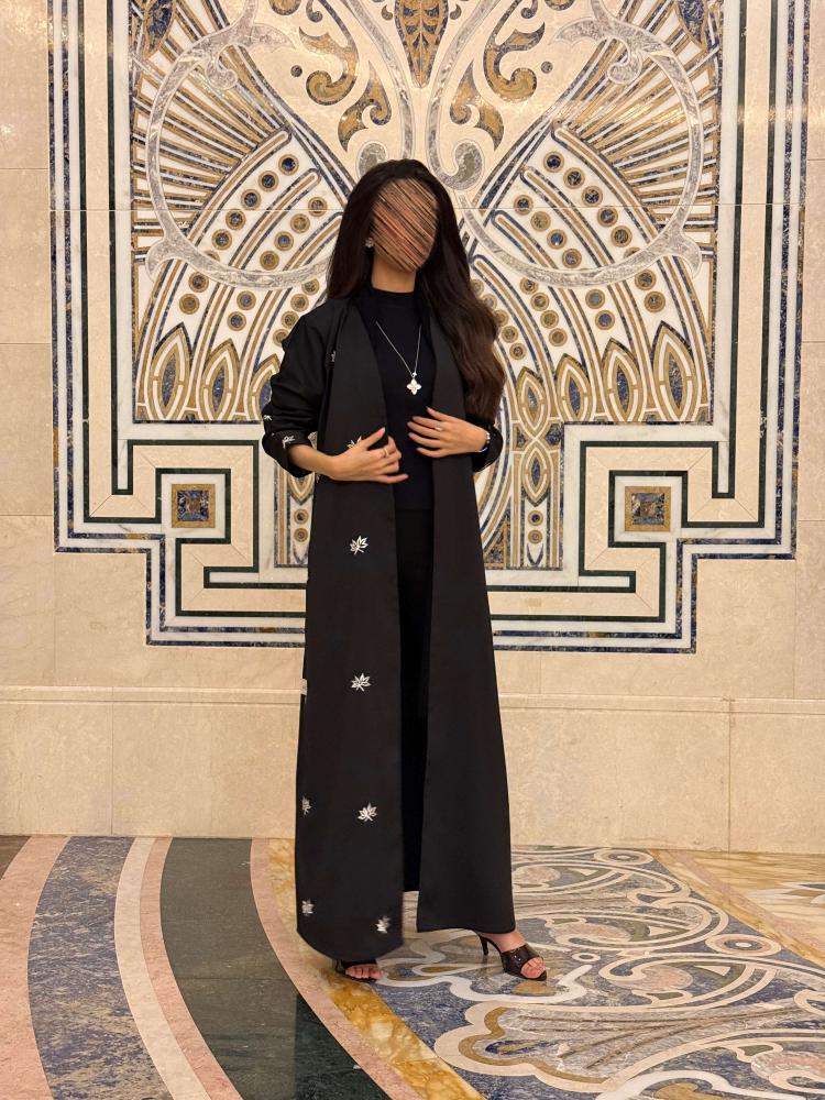 يأتي التصميم بلون أسود ملكي مزين بتطريز أنيق على شكل ورود صغيرة متفرقة، موزعة بعناية على القماش بما في ذلك الأكمام، مما يضفي لمسة أنثوية راقية دون مبالغة. الخيوط المستخدمة في التطريز بلون متباين تُبرز التفاصيل الدقيقة، ما يعزز من فخامة العباية ويجعلها مثالية للإطلالات الفاخرة والمميزة.