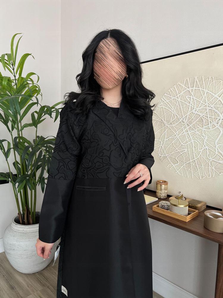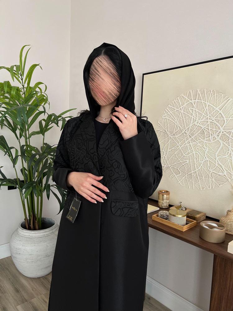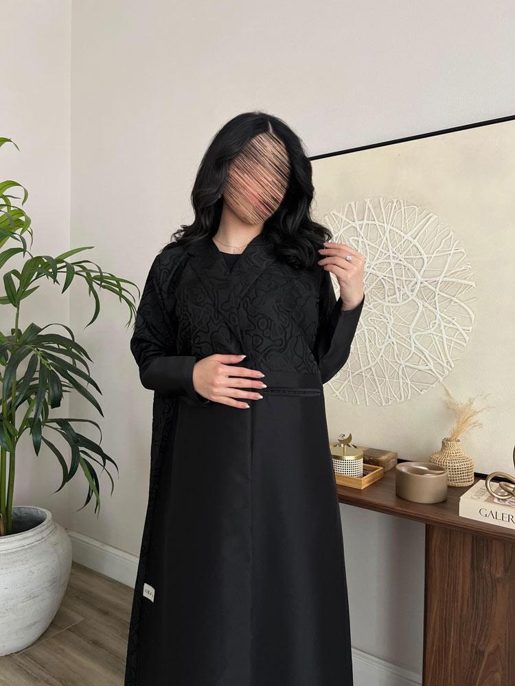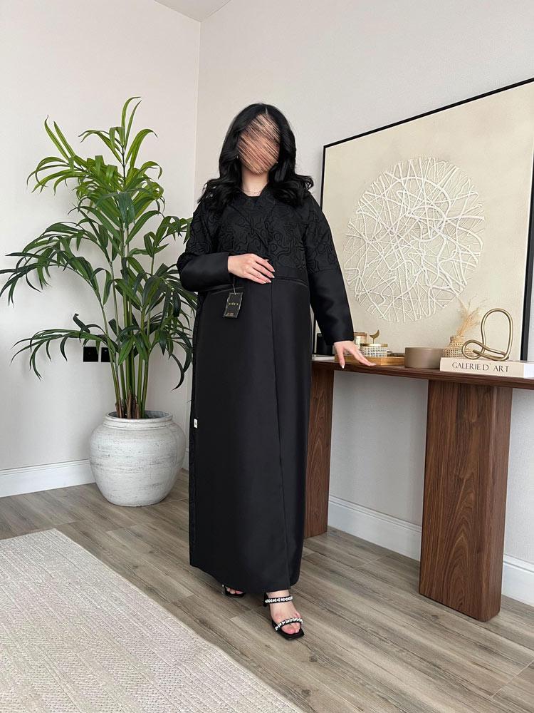 مزيج من الأقمشة الفاخرة بتداخلات متناغمة لقماش الجاكار في أعلى العباية، والأجزاء المتبقية من قماش كوبرا الأسود المعروف بفخامة لونه ولمعته المعتدله وقوامه المميز وملمسه الناعم.