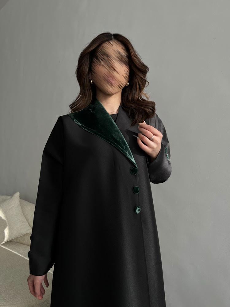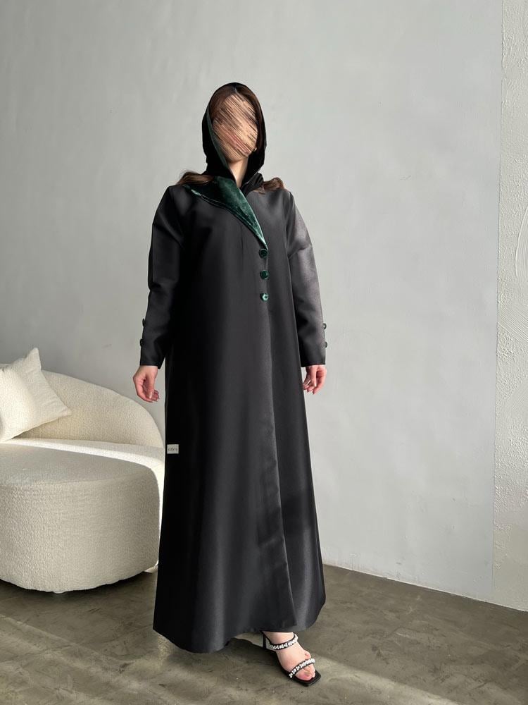 عباية سوداء من قماش كوبرا الفاخر المعروف بفخامة لونه ولمعته المعتدله وقوامه الثابت، تتميز العباية بتصميم فريد بنصف ياقة من المخمل الفاخر باللون الأخضر الملكي، وكذلك أزرار من المخمل مرصوصة بتناغم في الجزء العلوي من العباية أسفل الياقة وكذلك على أطراف الأكمام.