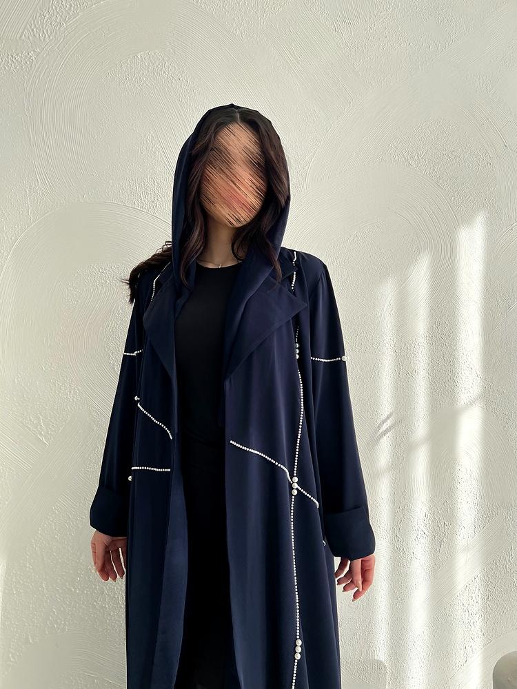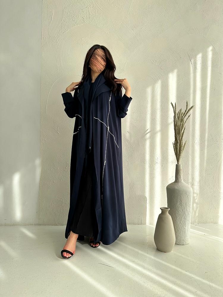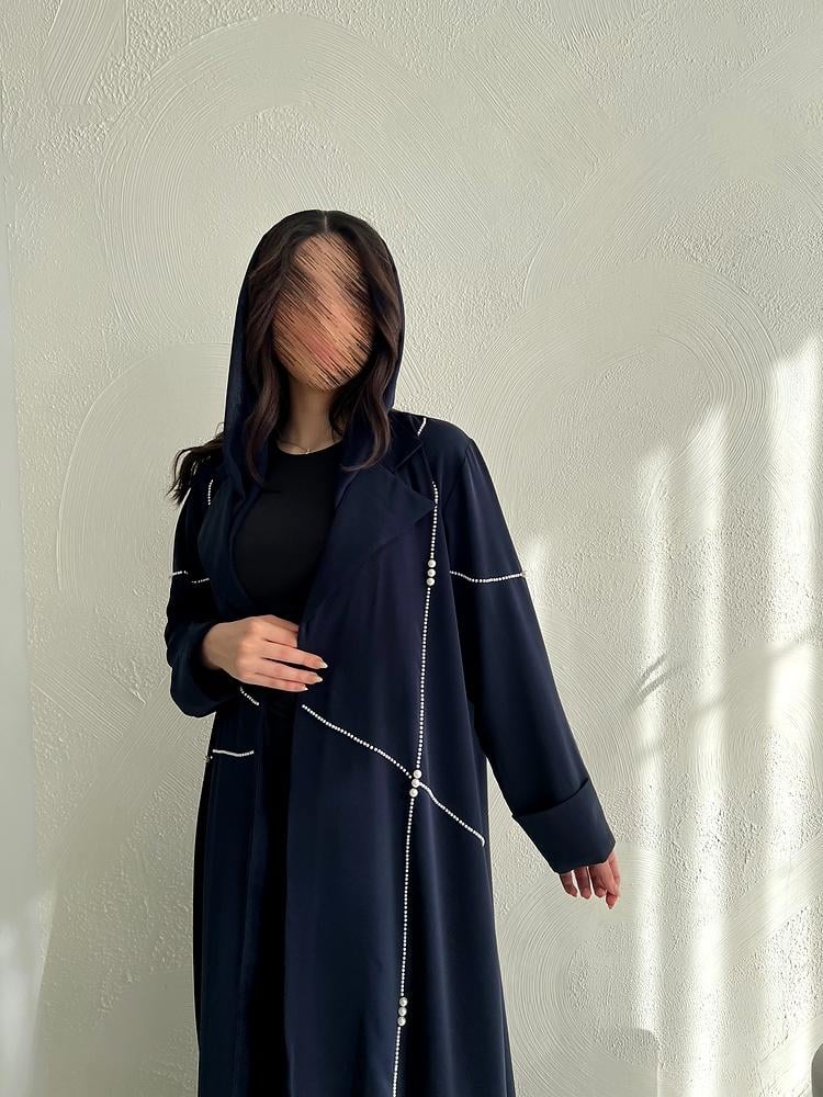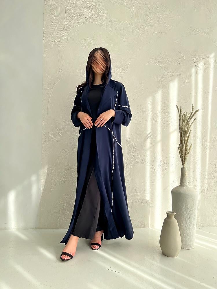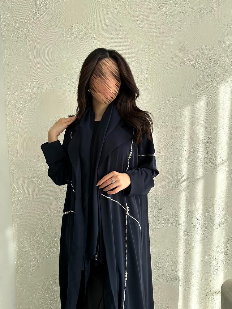 يزين التصميم خطوط أنيقة من حبات اللؤلؤ اللامعة، تمتد بتناغم على الجانبين بطريقة فنية تمنح العباية لمسة عصرية تلفت الأنظار دون مبالغة. أما قصة العباية فهي انسيابية وفضفاضة مع أكمام مستقيمة