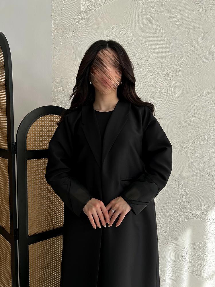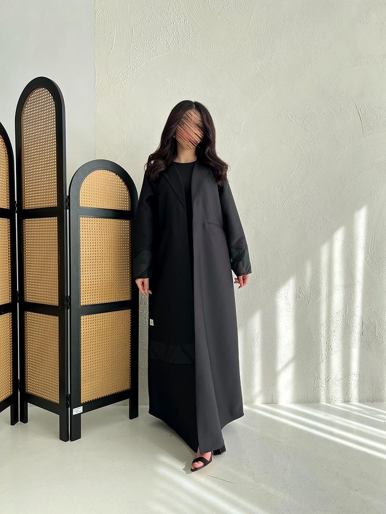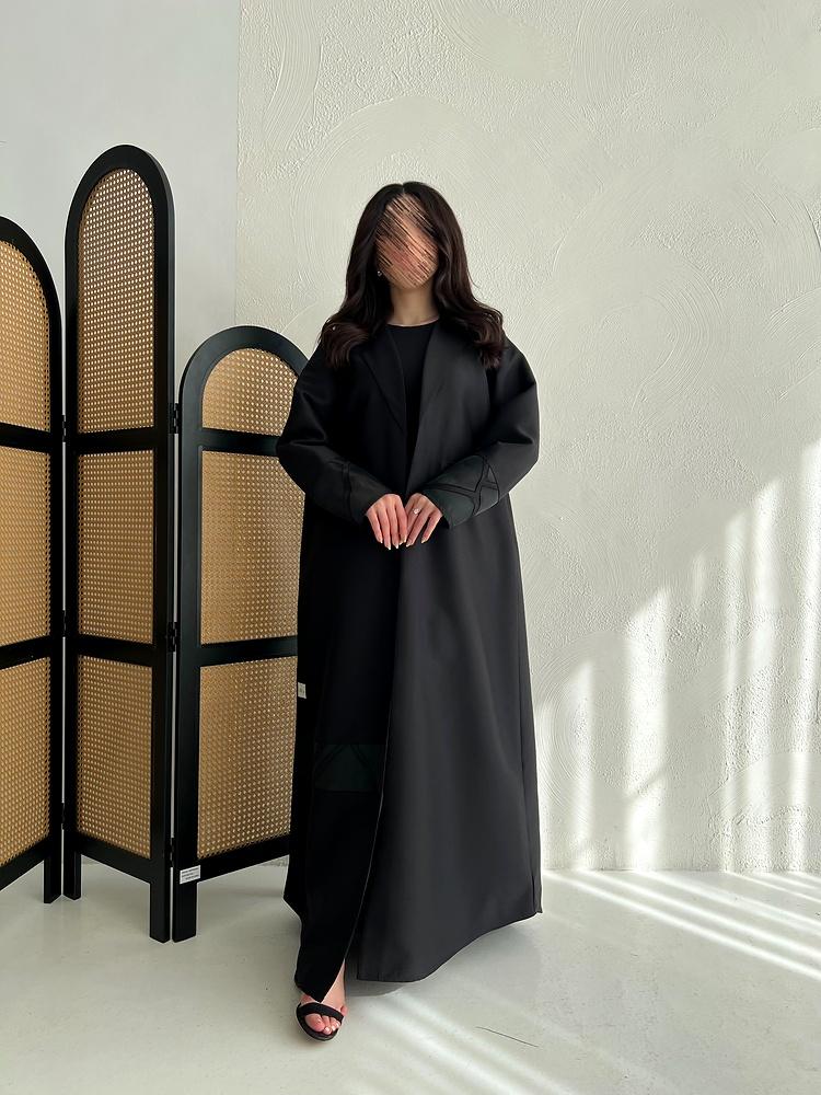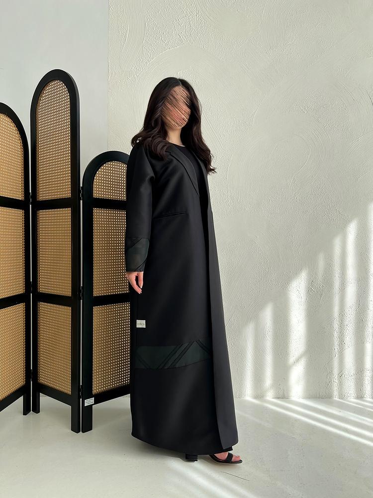 تميز التصميم بإضافة تداخلات فنية من قماش الجاكار الفاخر على الأكمام وأسفل العباية، بنقوش هندسية ناعمة تعكس أناقة مدروسة وتضفي لمسة مميزة على الإطلالة دون تكلف. يظهر الجاكار بلونه المتناغم مع لون العباية الأساسي ليمنحها طابعاً عصرياً وراقيًا في الوقت نفسه.